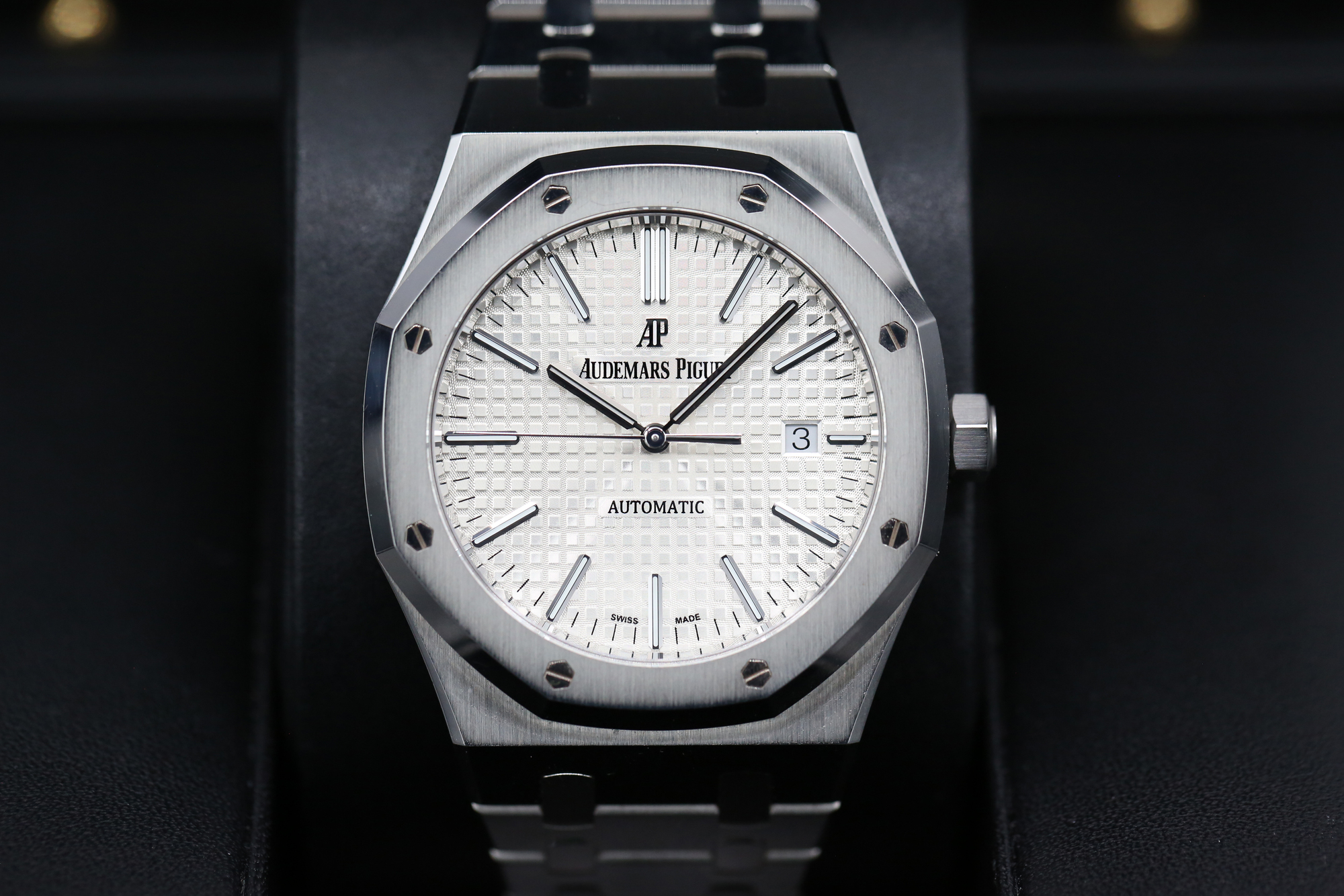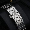 THIS WATCH ALSO BOASTS WHITE GOLD APPLIED HOUR MARKERS, ROYAL OAK HANDS WITH LUMINESCENT COATING AND A DATE WINDOW AT 3 O’CLOCK.