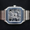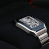 The Skeleton watch features hours and minutes with skeletonised bridges forming Roman numerals, covered in blue lacquer, the option of a second strap in blue rubber with interchangeable steel folding buckle and both straps are fitted with the “QuickSwitch” interchangeability system.