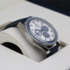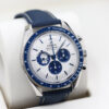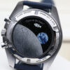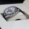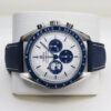 This is a 42mm 50th anniversary model that comes on a nylon fabric strap, a stainless steel case, a stylish silver dial that includes 3 sub dials and a blue ceramic bezel with a tachymetric scale.