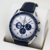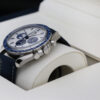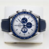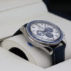 This is a 42mm 50th anniversary model that comes on a nylon fabric strap, a stainless steel case, a stylish silver dial that includes 3 sub dials and a blue ceramic bezel with a tachymetric scale.
