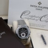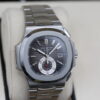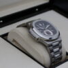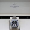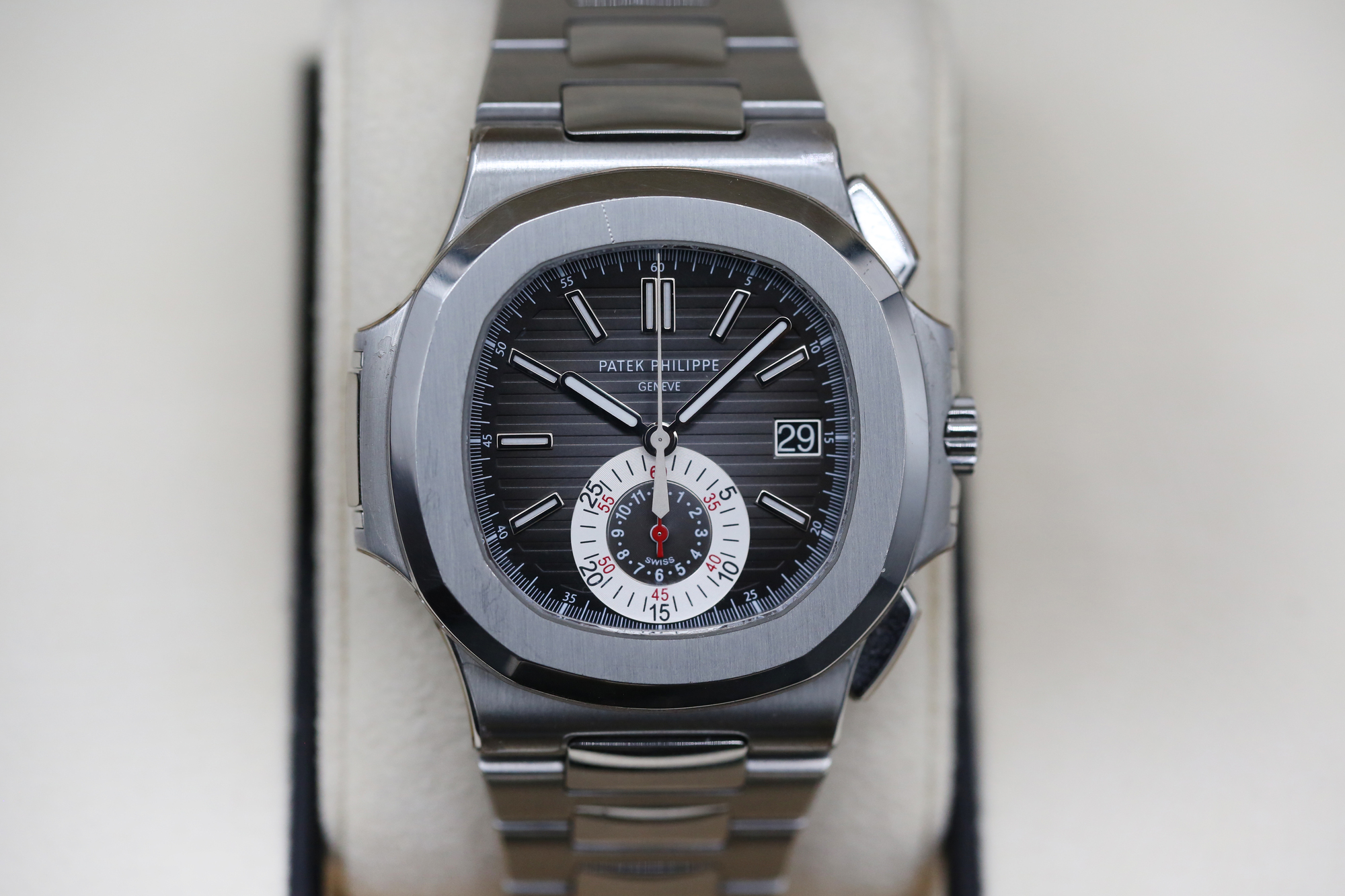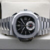 This version of the Nautilus has a beautiful black horizontally embossed dial and a chronograph monocounter at 6 o’clock, with 60-minute and 12-hour display.