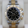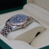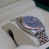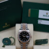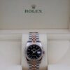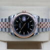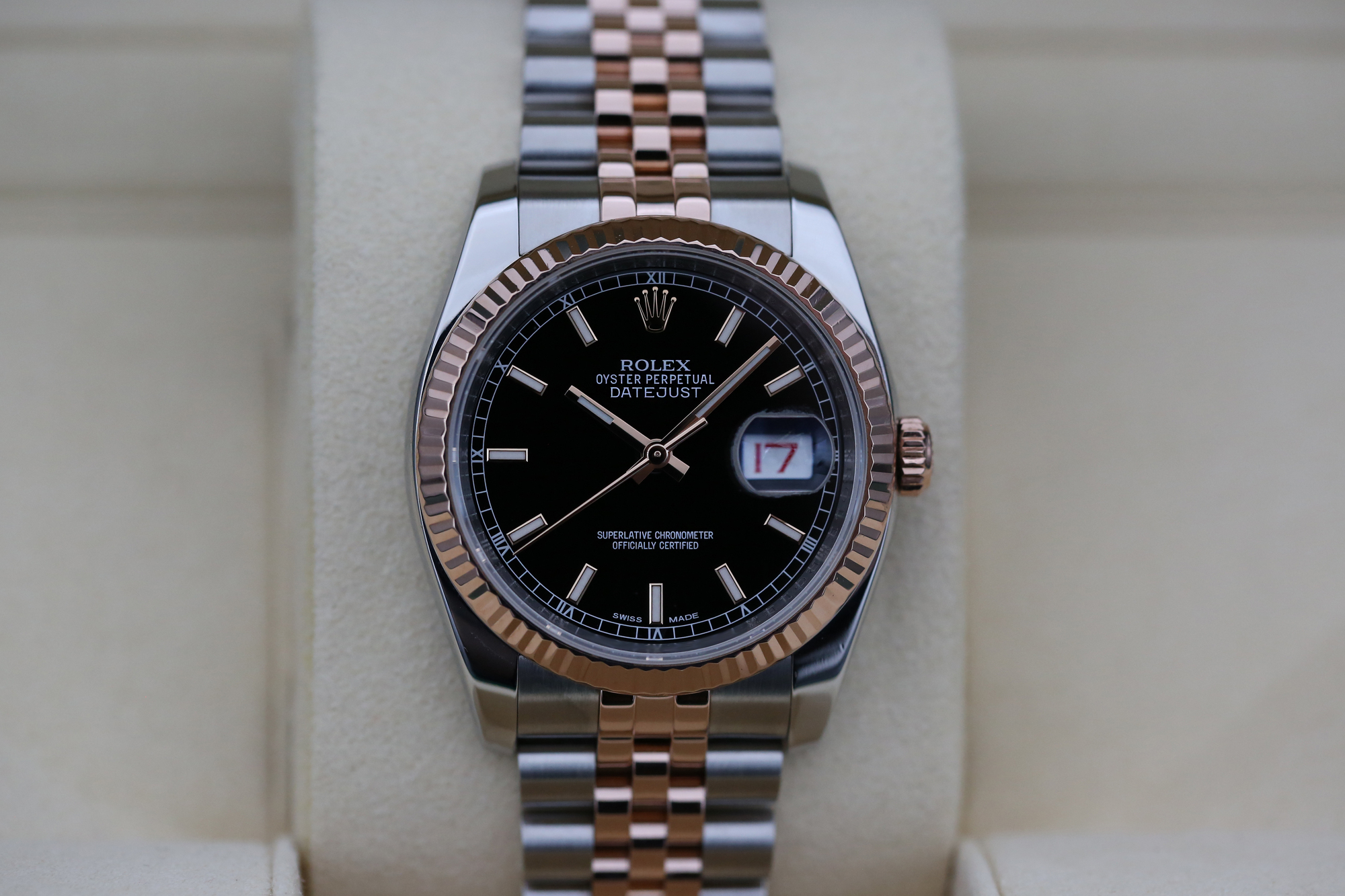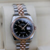 The watch is a beautiful combination of rose gold and oystersteel that features a stylish black dial, a date window at 3 o’clock and a rose gold fluted bezel.