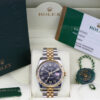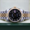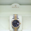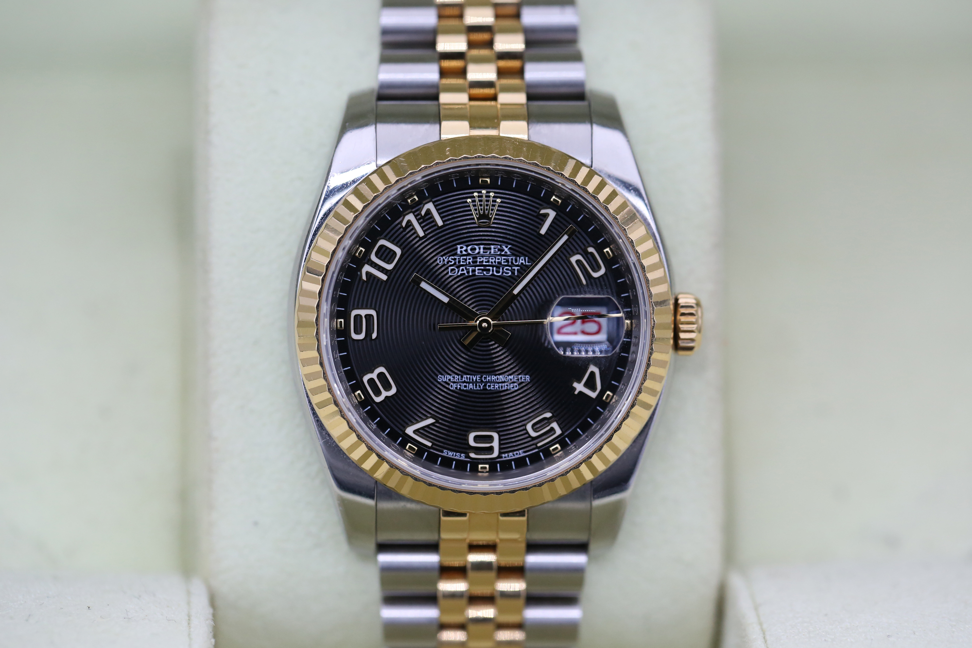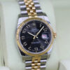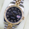 This watch is a combination of 18ct gold and oystersteel that features a stylish black dial, Arabic numerals, a date window at 3 o’clock and an 18ct gold fluted bezel.