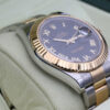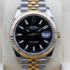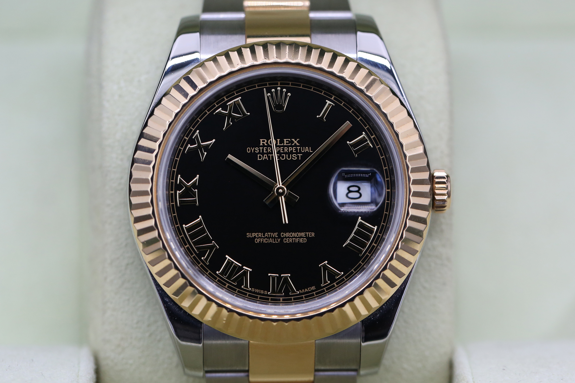 THIS WATCH IS A COMBINATION OF 18CT YELLOW GOLD AND OYSTERSTEEL THAT FEATURES A SLEEK STYLISH BLACK DIAL WITH ROMAN NUMERAL HOUR MARKERS AND A YELLOW GOLD FLUTED BEZEL.