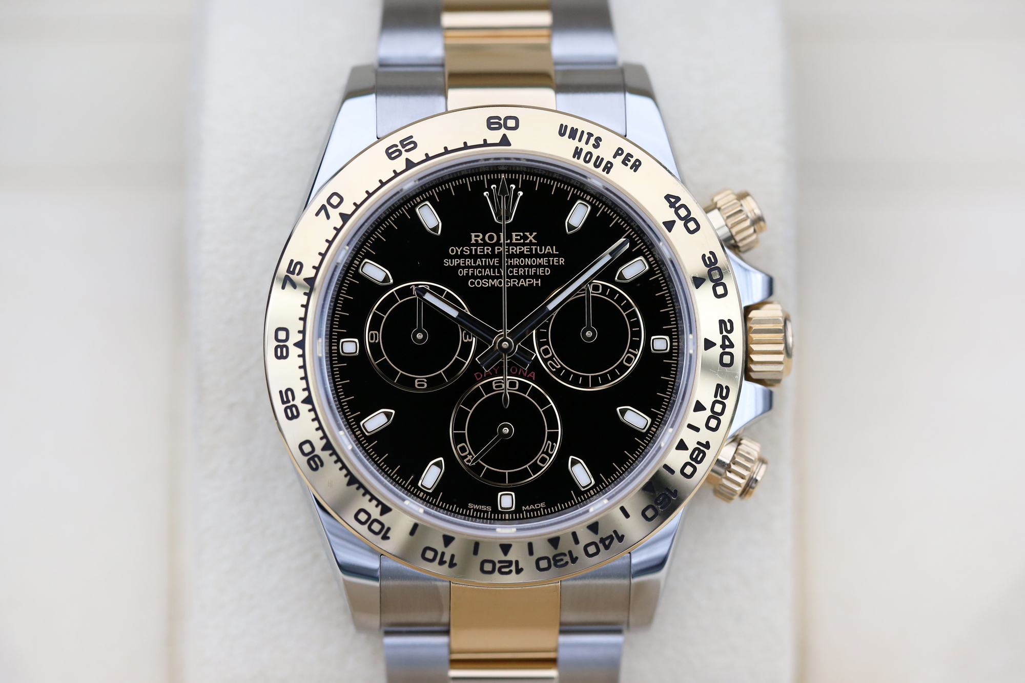 THE WATCH IS A COMBINATION OF 18CT GOLD AND OYSTERSTEEL THAT FEATURES A STYLISH BLACK DIAL AND GOLD DETAIL ON BOTH THE HOUR MARKERS AND SUB DIALS.