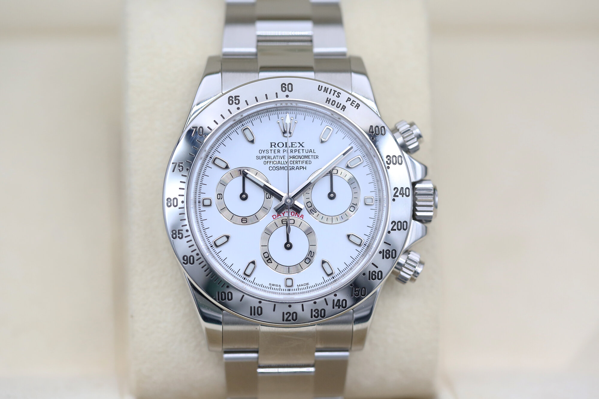 Here we have the Rolex Daytona Cosmograph-white This is a 40mm model and comes on the famous oyster bracelet with a stunning white dial, white hour markers and 3 steel trimmed sub-dials. The dial is nicknamed the “APH dial” due to a small spacing error in the word cosmogr aph... Read More