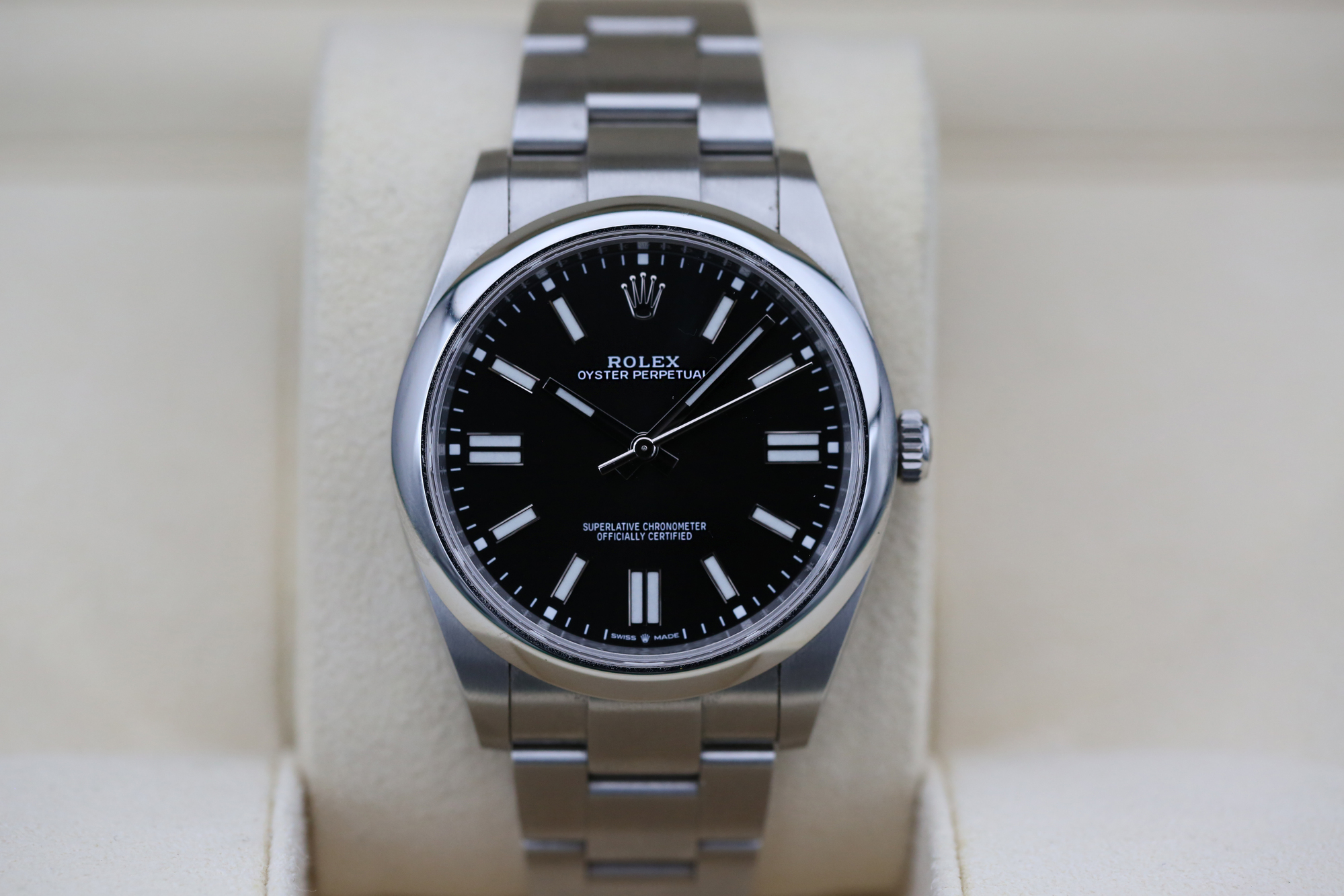 THIS IS A 41MM MODEL AND COMES ON THE FAMOUS OYSTER BRACELET WITH A STYLISH BLACK DIAL AND A SMOOTH OYSTERSTEEL BEZEL.