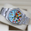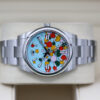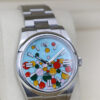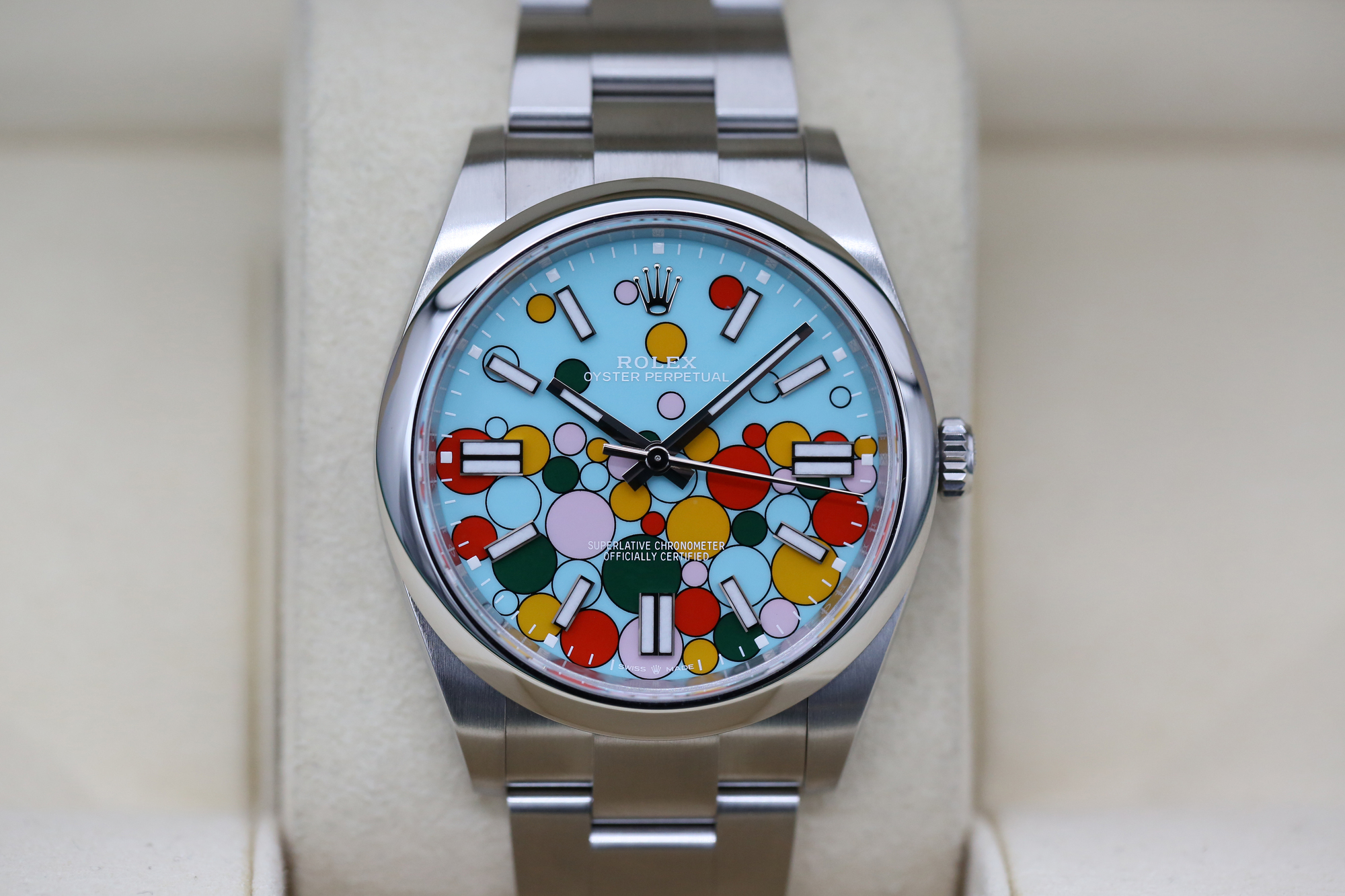 The dial named ‘celebration’ is composed of differently sized bubbles fringed with black, it encapsulates the vivid colours of the lacquered dials introduced in 2020, bringing turquoise blue into play for the background colour, and candy pink, yellow, coral red and green for the bubbles.