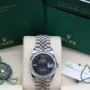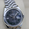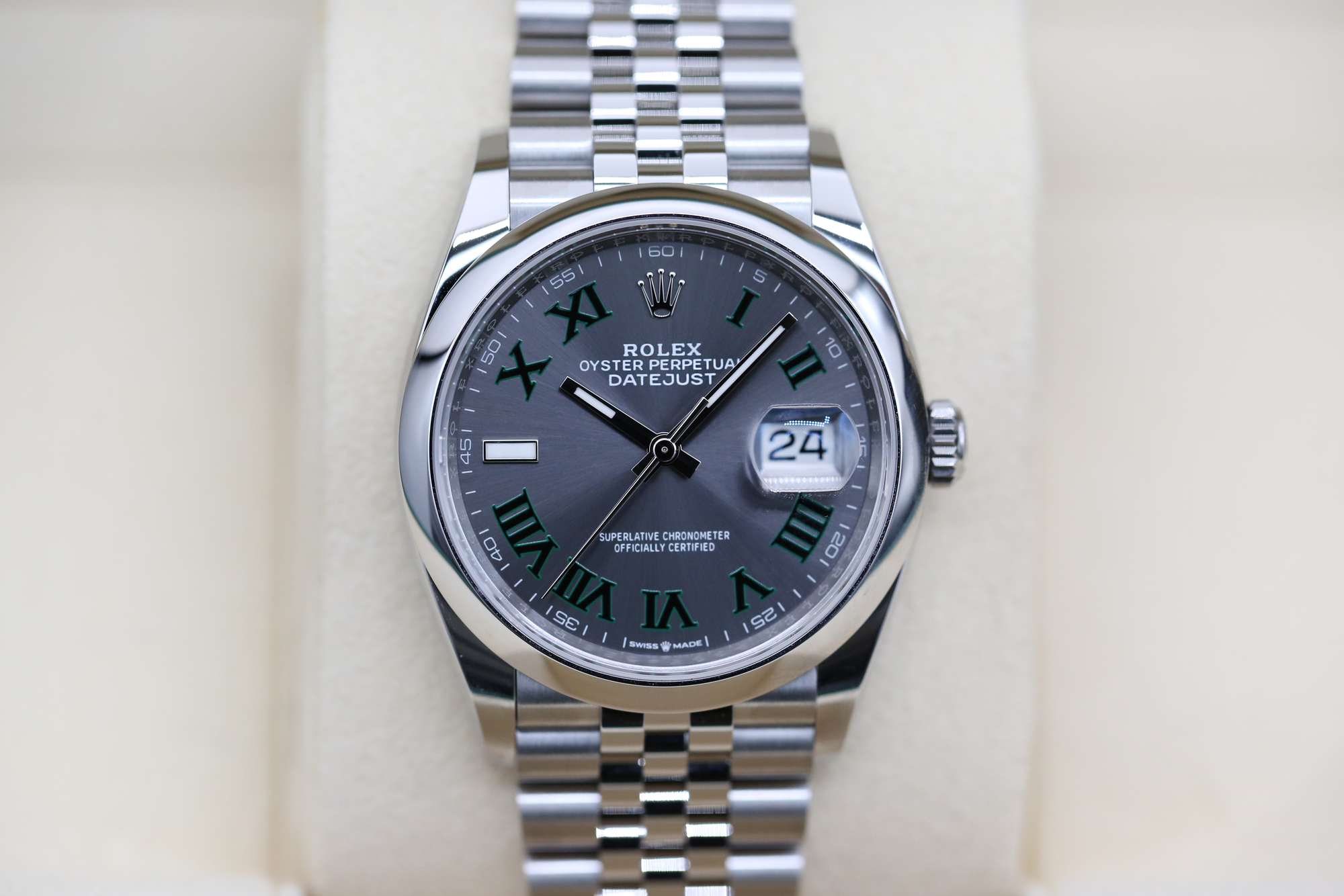 THE WATCH FEATURES A STUNNING SLATE DIAL WITH GREEN OUTLINED ROMAN NUMERAL HOUR MARKERS, A DATE WINDOW AT 3 O’CLOCK AND A SMOOTH OYSTERSTEEL BEZEL.