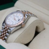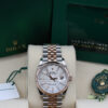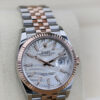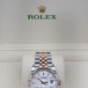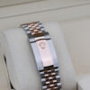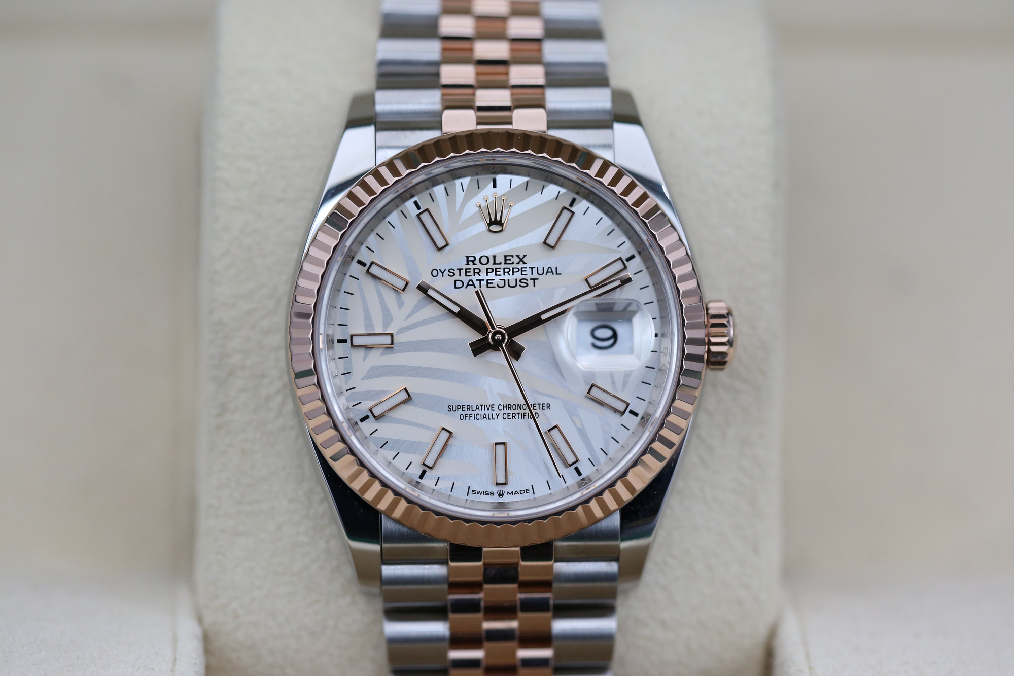 THIS WATCH IS A COMBINATION OF 18CT ROSE GOLD AND OYSTERSTEEL THAT FEATURES A STUNNING PALM DIAL, DATE WINDOW AT 3 0’CLOCK AND AN 18CT ROSE GOLD FLUTED BEZEL.