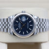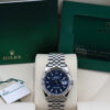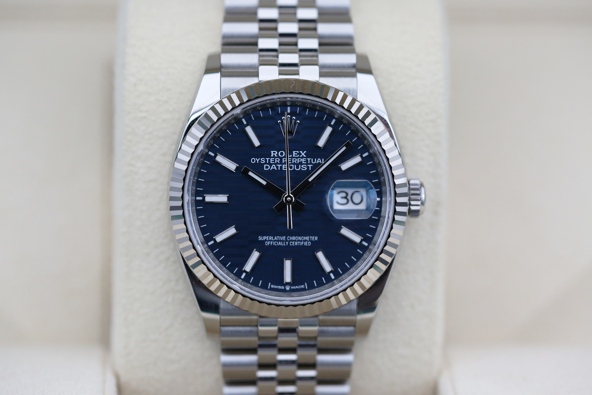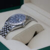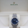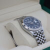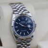 The watch is a beautiful combination of white gold and oystersteel that features a stunning blue motif dial, a date window at 3 o’clock and a white gold fluted bezel.