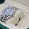 The watch is a combination of white gold and oystersteel that features a stunning slate dial with green outlined roman numeral hour markers, a date window at 3 o’clock and a white gold fluted bezel.