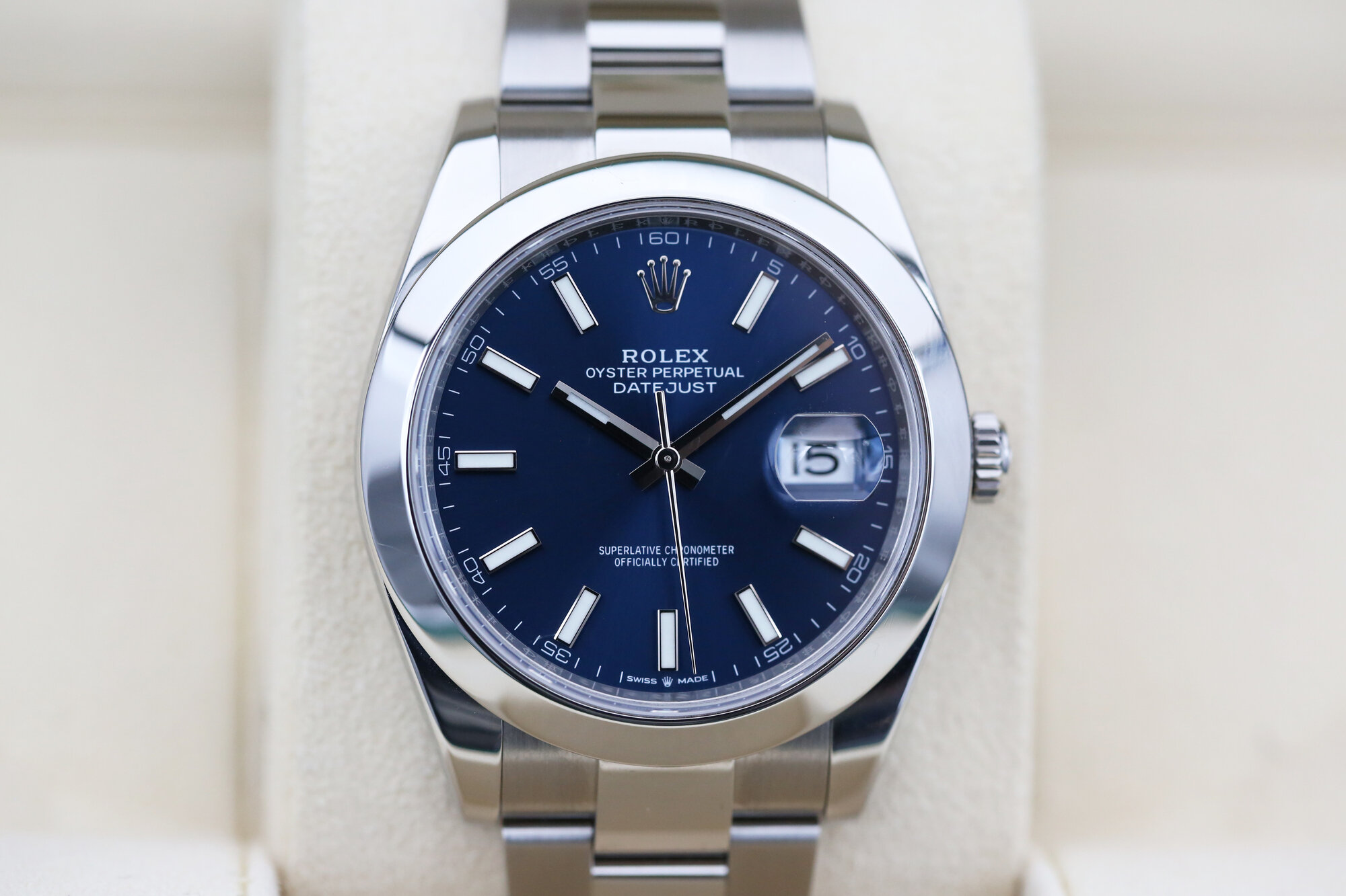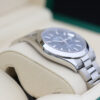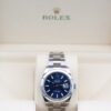 This watch features a stunning blue dial, contrasting white index hour markers, a date window at 3 o’clock and a smooth oystersteel bezel.