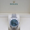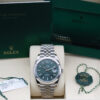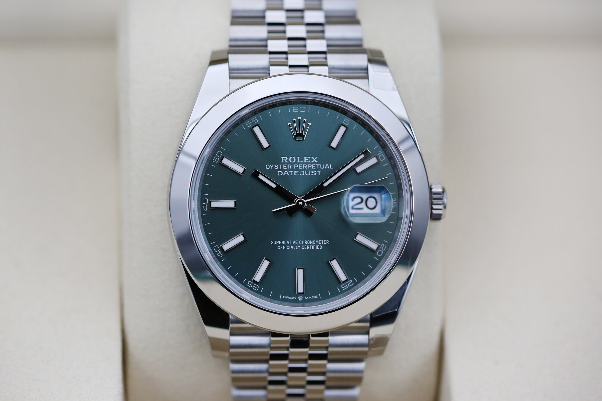 This watch features a stunning mint green dial, contrasting white index hour markers, a date window at 3 o’clock and a smooth oystersteel bezel.
