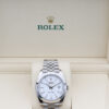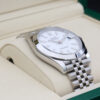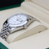 This watch features a stunning white dial, index hour markers, a date window at 3 o’clock and a smooth oystersteel bezel.