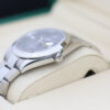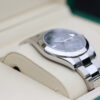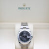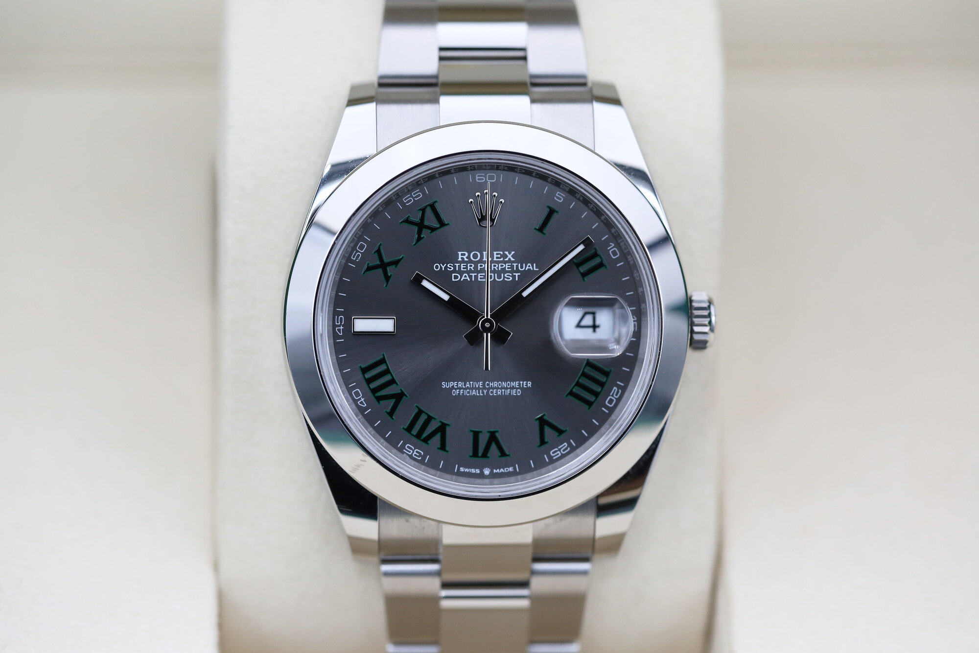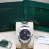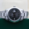 The watch features a stunning slate dial with green outlined roman numeral hour markers, a date window at 3 o’clock and a smooth oystersteel bezel.