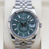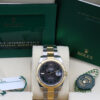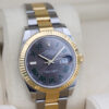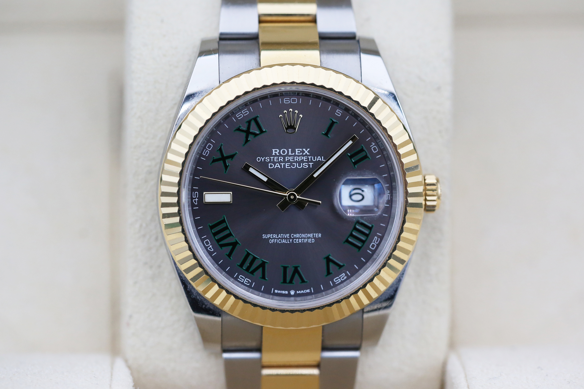 The watch is a combination of 18ct gold and oystersteel that features a stunning slate dial with green outlined roman numeral hour markers, a date window at 3 o’clock and a white gold fluted bezel.