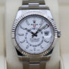 THE WATCH IS A COMBINATION OF WHITE GOLD AND OYSTERSTEEL THAT FEATURES A STUNNING BLUE DIAL WITH A SUNRAY FINISH THAT IS OBTAINED USING MASTERFUL BRUSHING TECHNIQUES TO CREATE A CHARACTERISTIC SUBTLE GLOW THAT MOVES DEPENDING ON THE POSITION OF THE WRIST.
