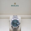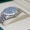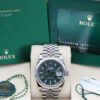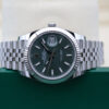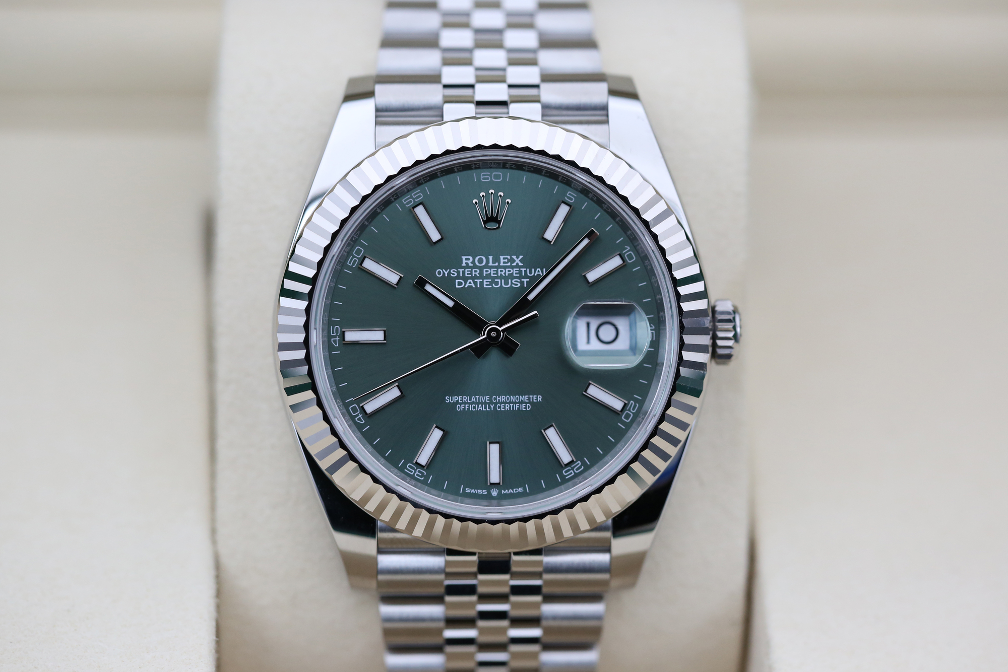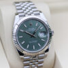 The watch is a beautiful combination of white gold and oystersteel that features a stunning mint green dial, a date window at 3 o’clock and a white gold fluted bezel.