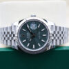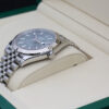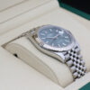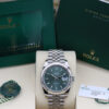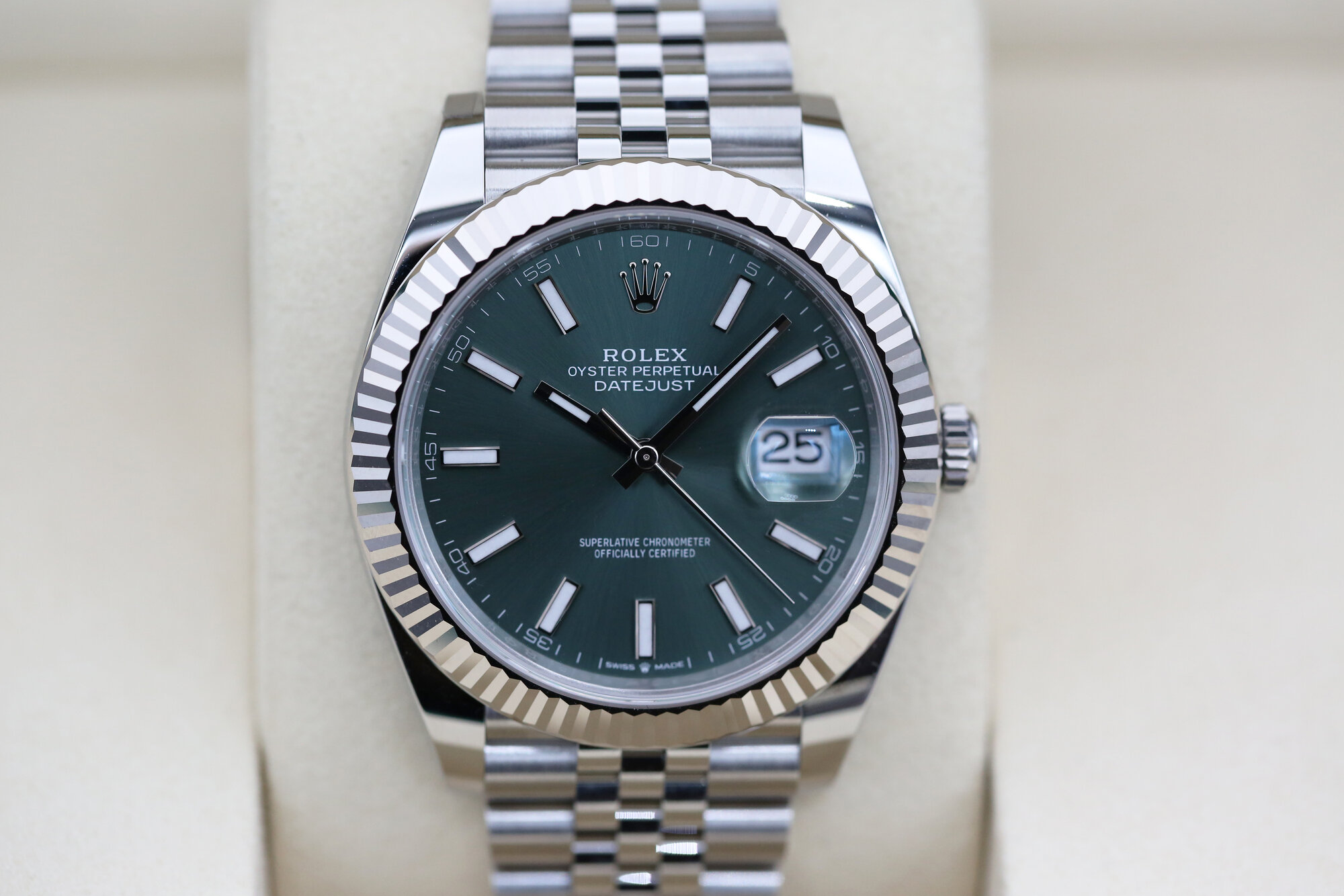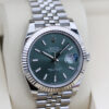 The watch is a beautiful combination of white gold and oystersteel that features a stunning mint green dial, a date window at 3 o’clock and a white gold fluted bezel.