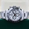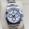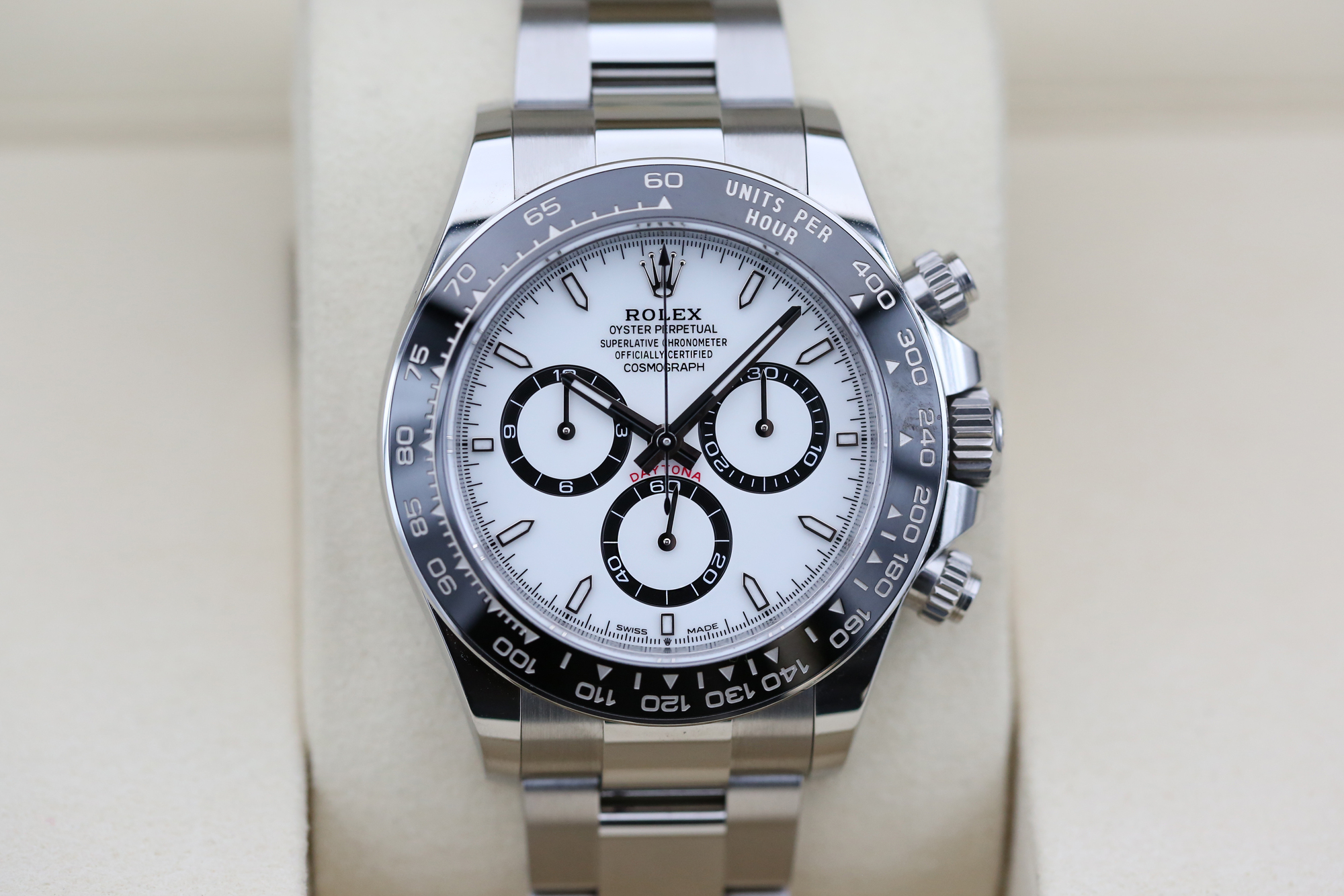 The watch boasts a stunning white dial, 18ct white gold detail on the hour markers and contrasting black trimmed sub-dials, this colour combination is affectionately known in the industry as “The Panda”.