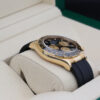 The watch boasts an 18ct gold case, a stylish black dial, 18ct gold detail on the hour markers and three contrasting gold sub-dials.