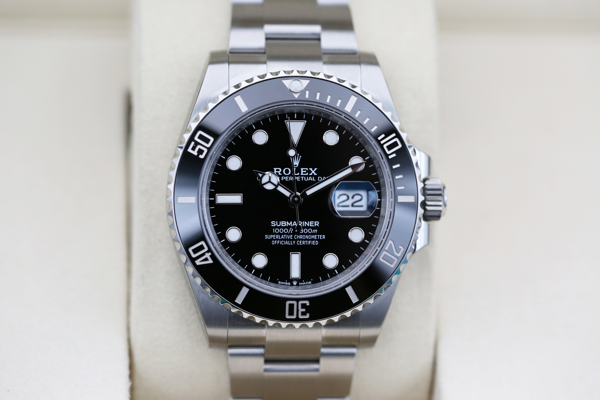 Here we have the Rolex Submariner–Black This is a 41mm model and comes on the famous oyster bracelet. This watch has a stylish black dial, date window at 3 o’clock and a cerachrom bezel with a black ceramic insert. The Submariner boasts a 60-minute rotatable bezel that allow a diver... Read More