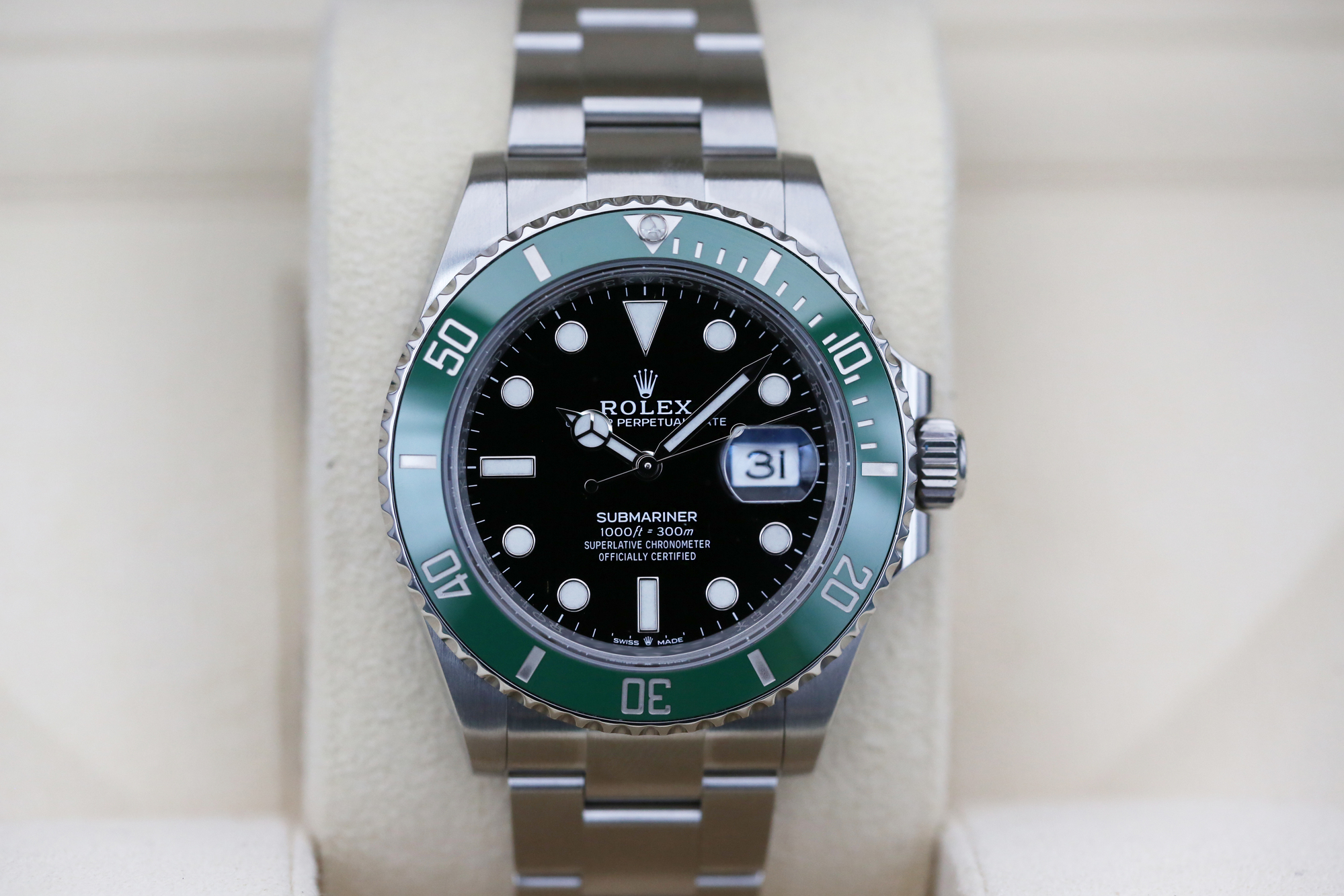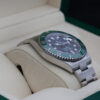It features a date window at 3 o’clock, a stylish black dial and a cerachrom bezel with a green ceramic insert, this colour combination is affectionately known in the industry as “The Starbucks”.