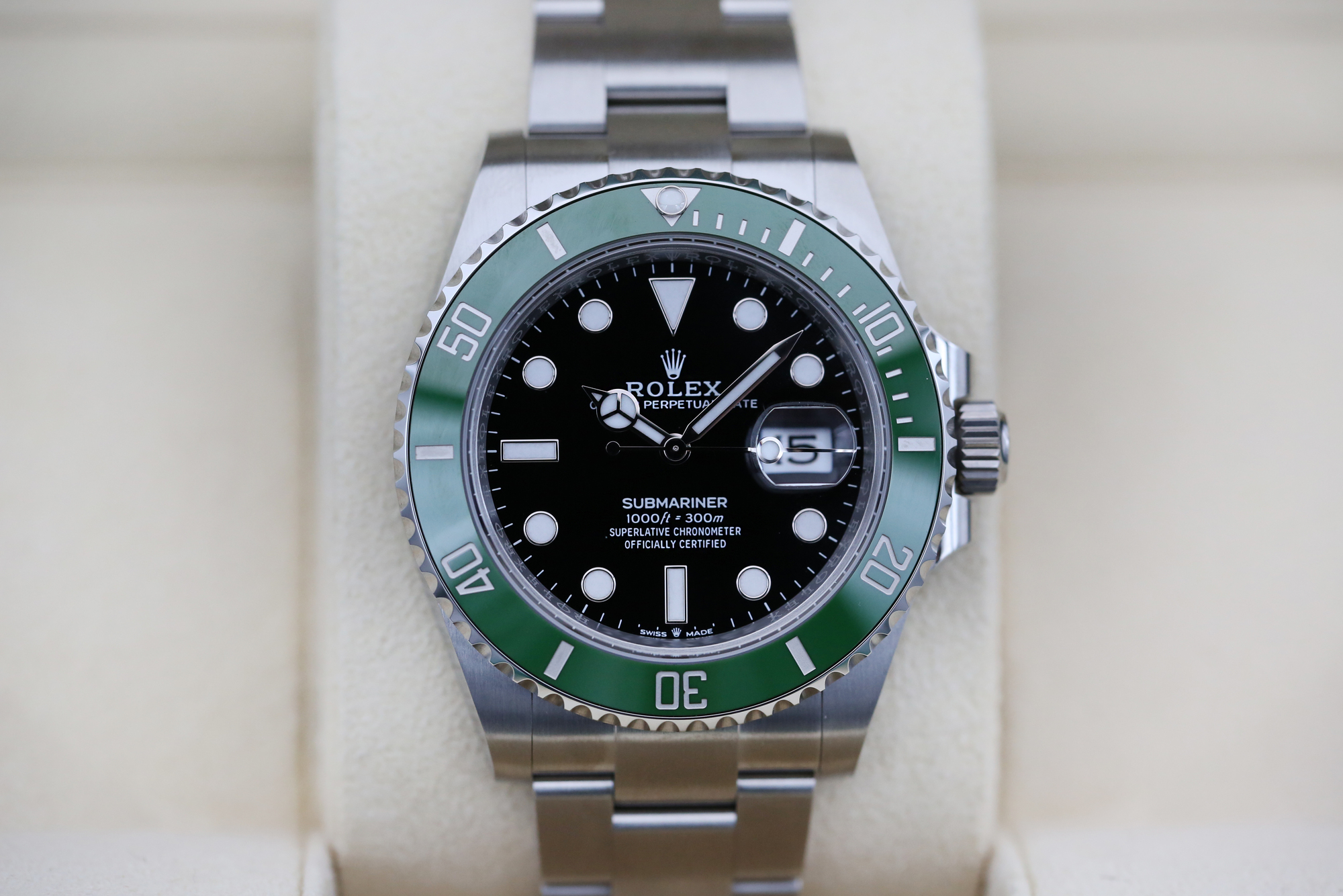 IT FEATURES A DATE WINDOW AT 3 O’CLOCK, A STYLISH BLACK DIAL AND A CERACHROM BEZEL WITH A GREEN CERAMIC INSERT, THIS COLOUR COMBINATION IS AFFECTIONATELY KNOWN IN THE INDUSTRY AS “THE STARBUCKS”.