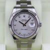 The watch features a stylish rhodium dial and a platinum bezel that has raised polished numerals and graduations that stand out clearly against a matt, sand-blasted background.