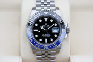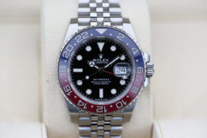 This watch features a stylish black dial and a cerachrom bezel with blue and red ceramic insert, this colour combination is affectionately known in the industry as “The Pepsi”.