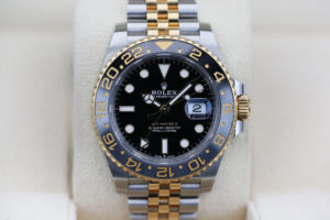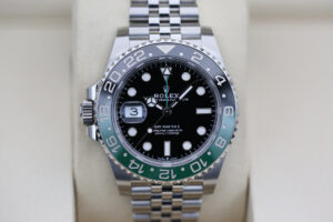 The GMT-Master II also boasts an arrow tipped hand which circles the dial once every 24 hours allowing the wearer to track another time zone on the 24 hour bezel, a date window at 3 o’clock and a chromalight display making the hour markers and hands more visible in the dark.