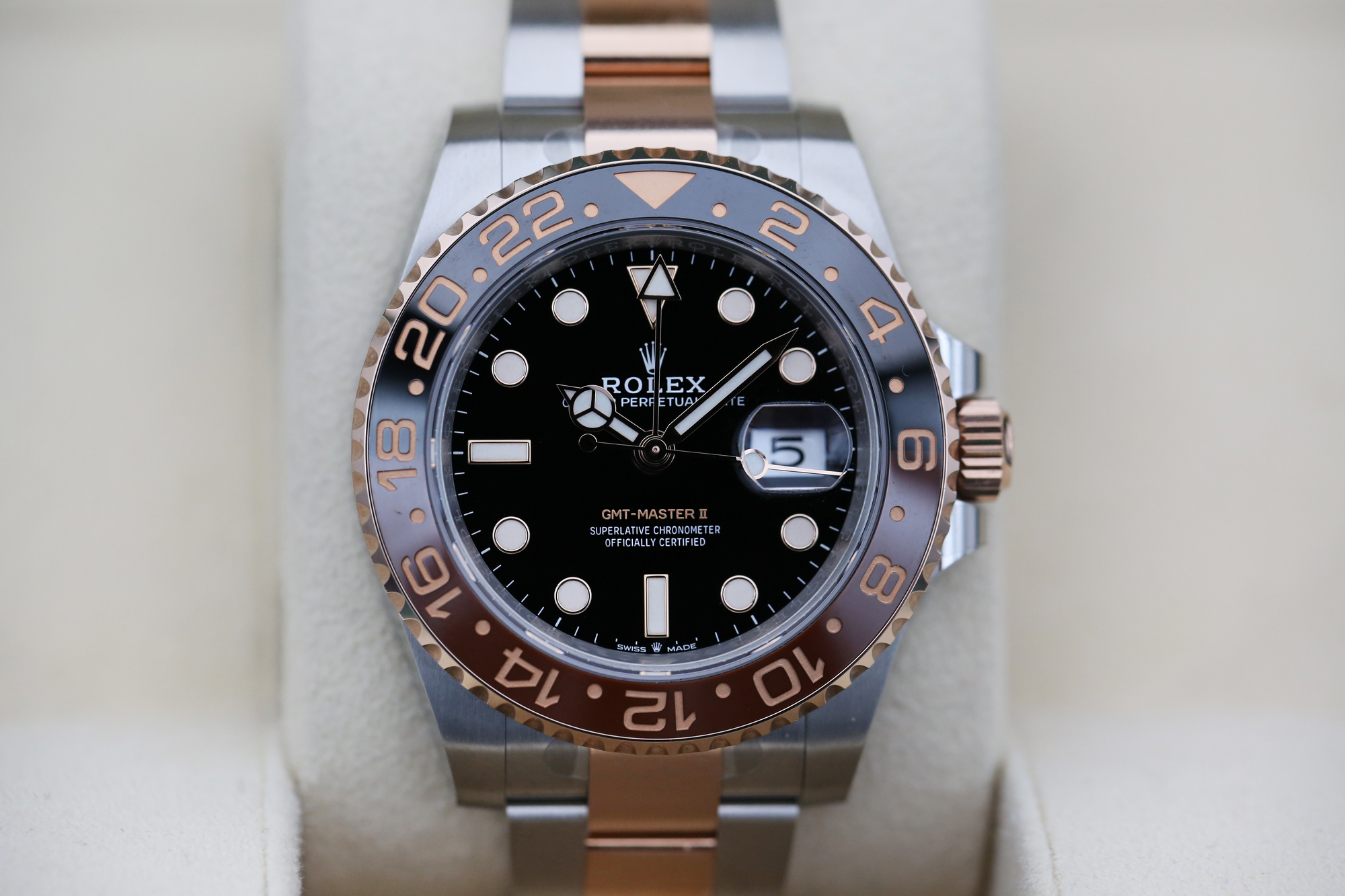 THIS WATCH IS A BEAUTIFUL COMBINATION OF 18CT ROSE GOLD AND OYSTERSTEEL THAT FEATURES A STYLISH BLACK DIAL AND A CERACHROM BEZEL WITH BLACK/BROWN CERAMIC INSERT, THIS COLOUR COMBINATION IS AFFECTIONATELY KNOWN IN THE INDUSTRY AS “THE ROOT BEER”.