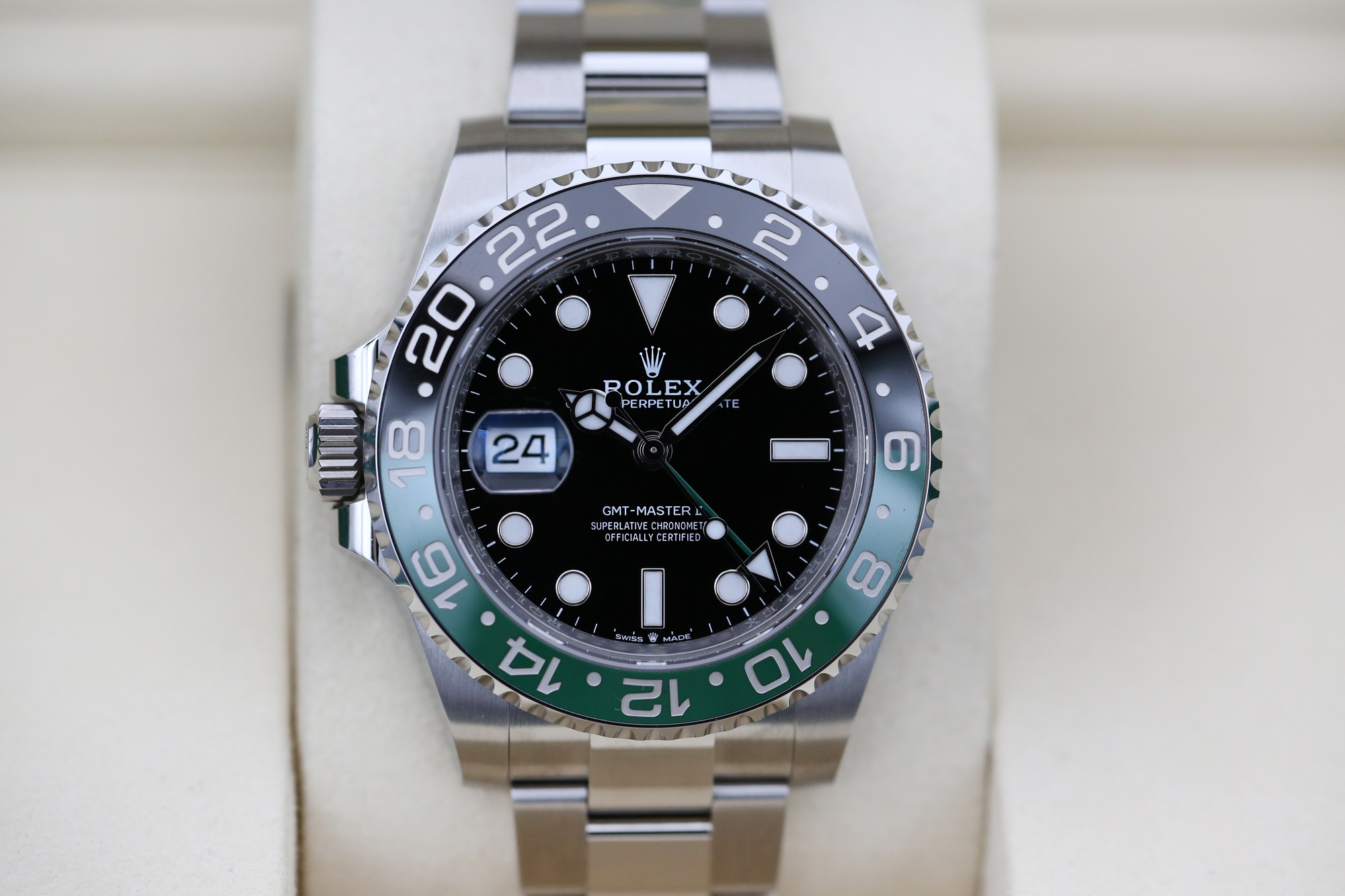 The GMT-Master II also boasts an arrow tipped hand which circles the dial once every 24 hours allowing the wearer to track another time zone on the 24 hour bezel and has a chromalight display making the hour markers and hands more visible in the dark.