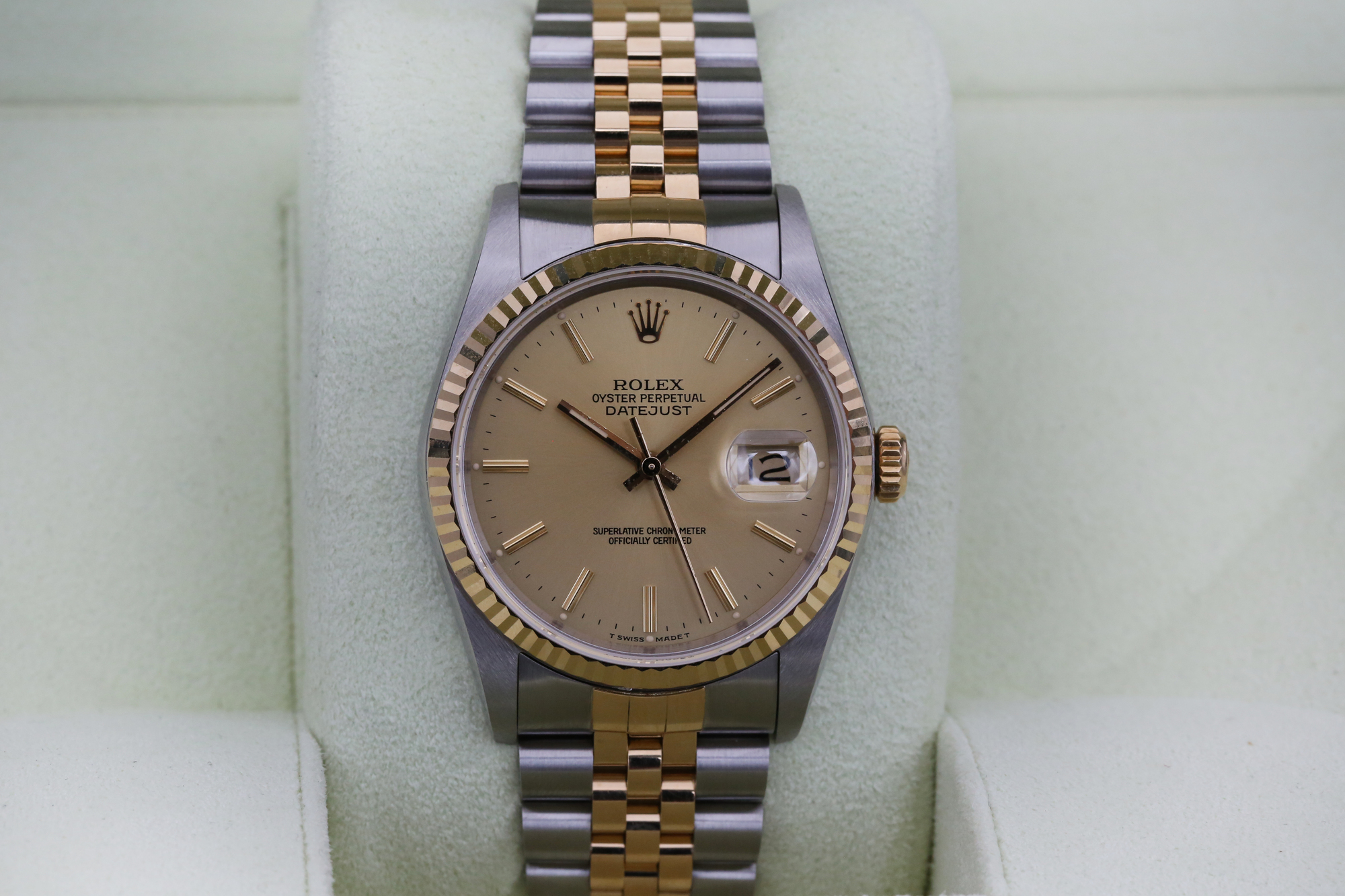 Here we have the Rolex Datejust- Champagne Index This is a 36mm model and comes on the famous jubilee bracelet. The watch is a beautiful combination of 18ct gold and oystersteel that features a stunning champagne dial, a date window at 3 o’clock, index hour markers and a 18ct gold... Read More