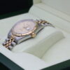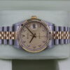 The watch is a beautiful combination of 18ct gold and oystersteel that features a stunning anniversary champagne dial, a date window at 3 o’clock, diamond hour markers and a 18ct gold fluted bezel.