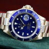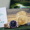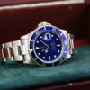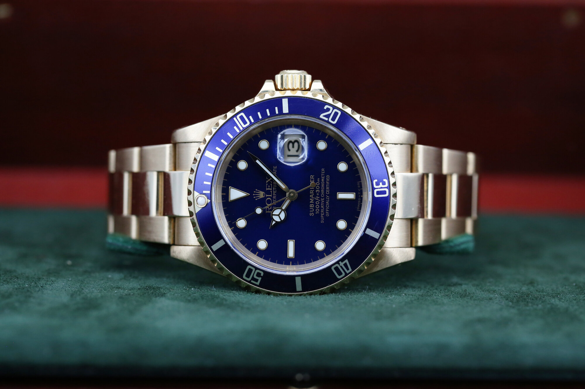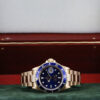The watch is crafted from 18ct gold has a date window at 3 o’clock, a stunning royal blue dial and a blue aluminium bezel insert and this colour combination is affectionately known in the industry as “The Bluesy Sub”.