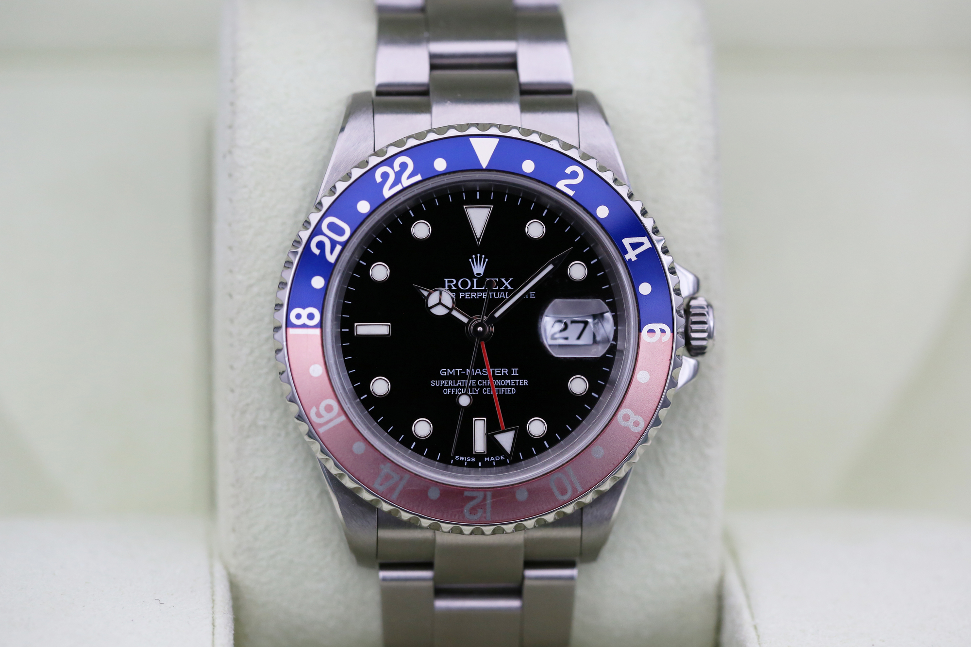 The GMT-Master II also boasts an arrow tipped hand which circles the dial once every 24 hours allowing the wearer to track another time zone on the 24 hour bezel and a date window at 3 o’clock.