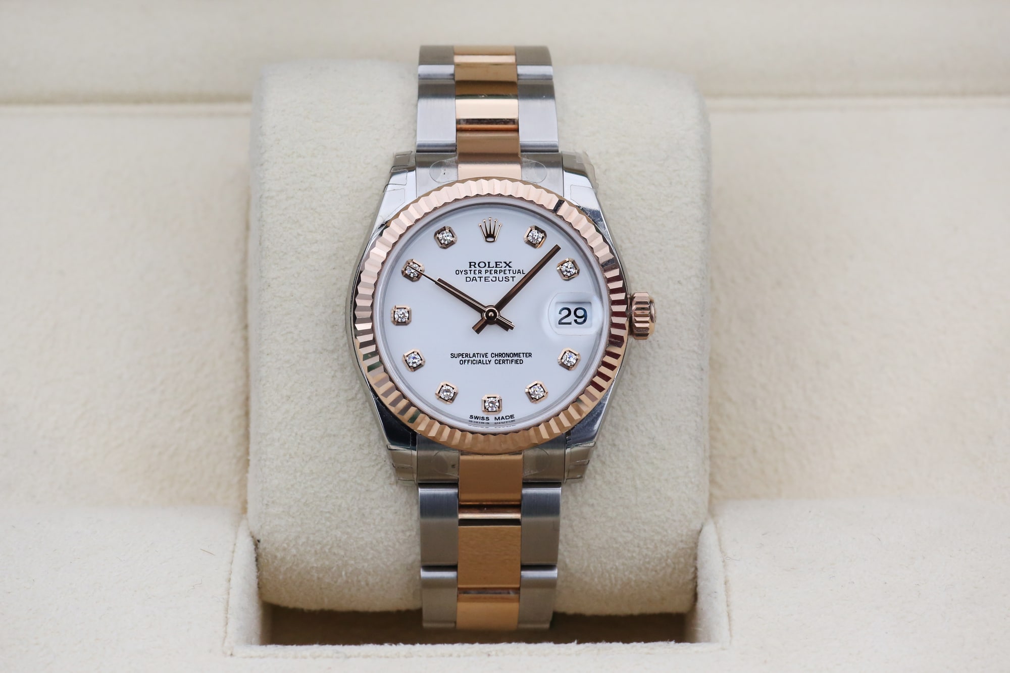Brand: Rolex Model: Datejust Reference No: 178271 Case: Two Tone Rose Gold (TTRG) Bracelet: Oyster Size: 31 Dial: White Diamond Bezel: Fluted Year: 04/2018 Condition: Preowned Box papers: Paperwork/Box Read More