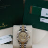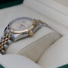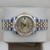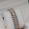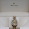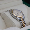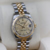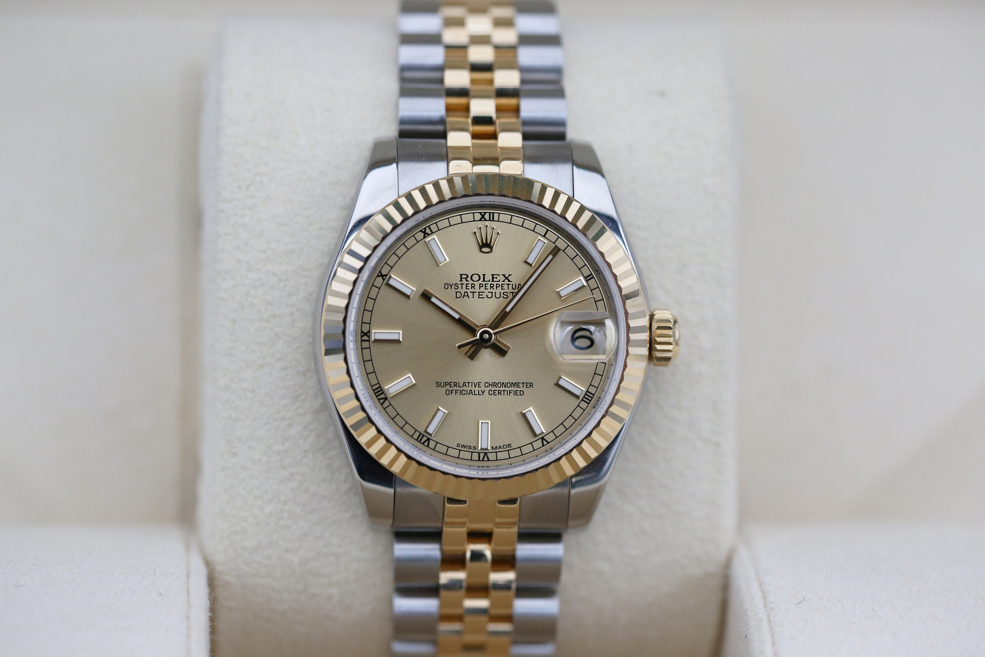 The watch is a beautiful combination of 18ct gold and oystersteel that features a stunning champagne dial, a date window at 3 o’clock, index hour markers and a 18ct gold fluted bezel.