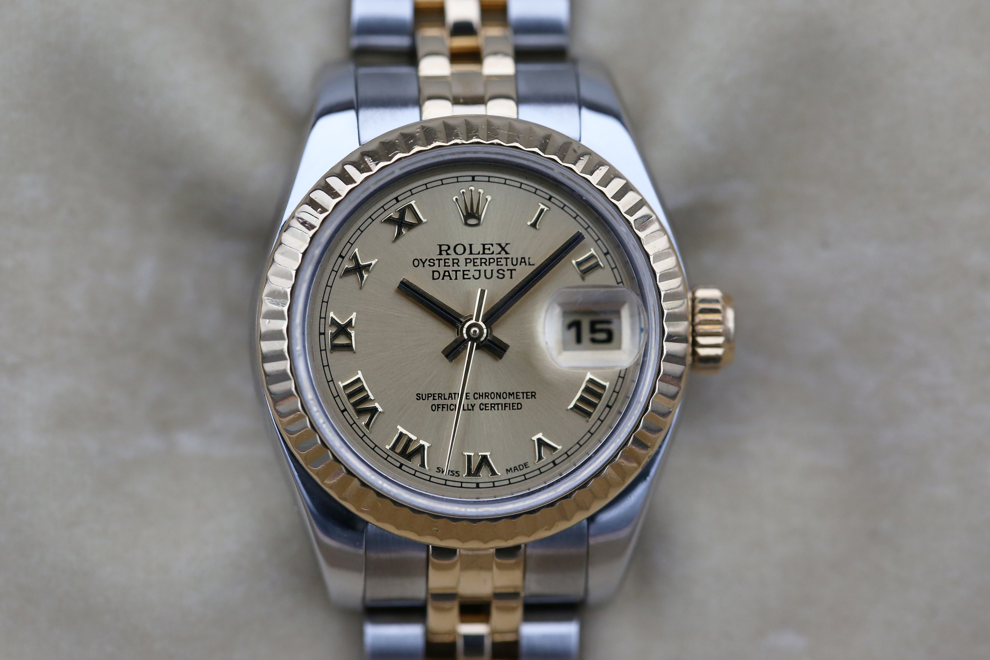 THIS WATCH IS A COMBINATION OF 18CT YELLOW GOLD AND OYSTERSTEEL THAT FEATURES A STUNNING CHAMPAGNE DIAL, ROMAN NUMERAL HOUR MARKERS AND A YELLOW GOLD FLUTED BEZEL.
