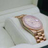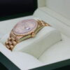 It boasts a beautiful champagne dial, diamond hour markers, day window at 12 o’clock, date window at 3 o’clock and has a factory diamond encrusted bezel.