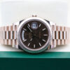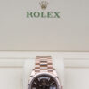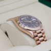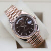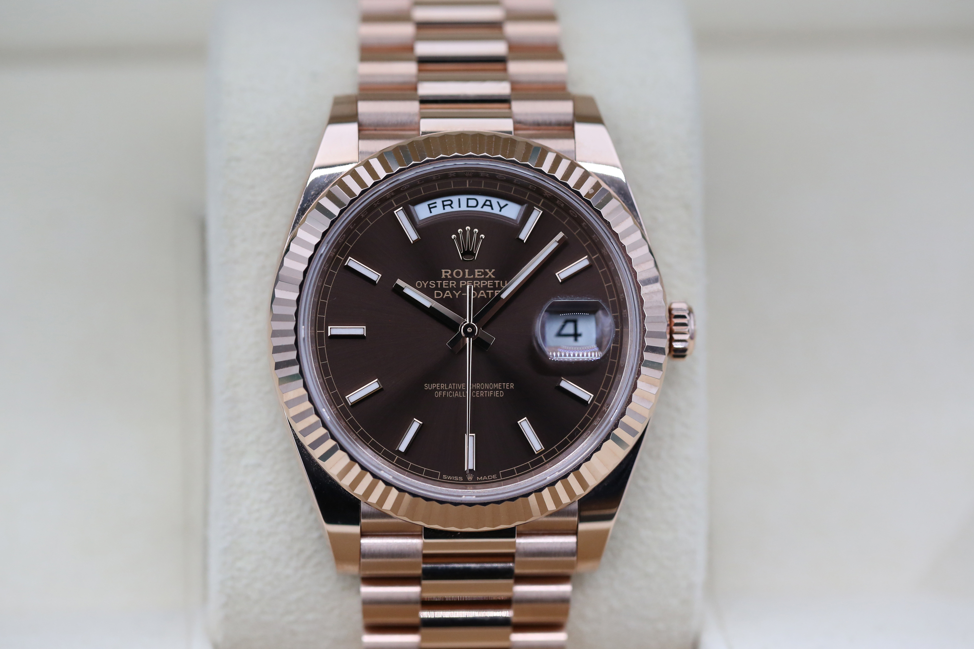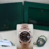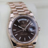 It boasts a stylish chocolate dial, Index hour markers, day window at 12 o’clock, date window at 3’oclock, a fluted bezel and the dial has a sunray finish that is obtained using masterful brushing techniques to create a characteristic subtle glow that moves depending on the position of the wrist.