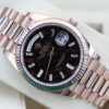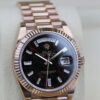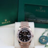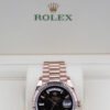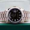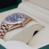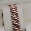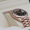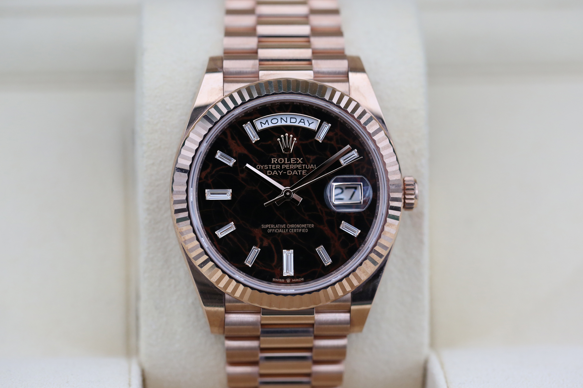 IT BOASTS BAGUETTE DIAMOND HOUR MARKERS, DAY WINDOW AT 12 O’CLOCK, DATE WINDOW AT 3’OCLOCK, A FLUTED BEZEL AND IS CRAFTED ENTIRELY FROM 18CT ROSE GOLD.