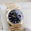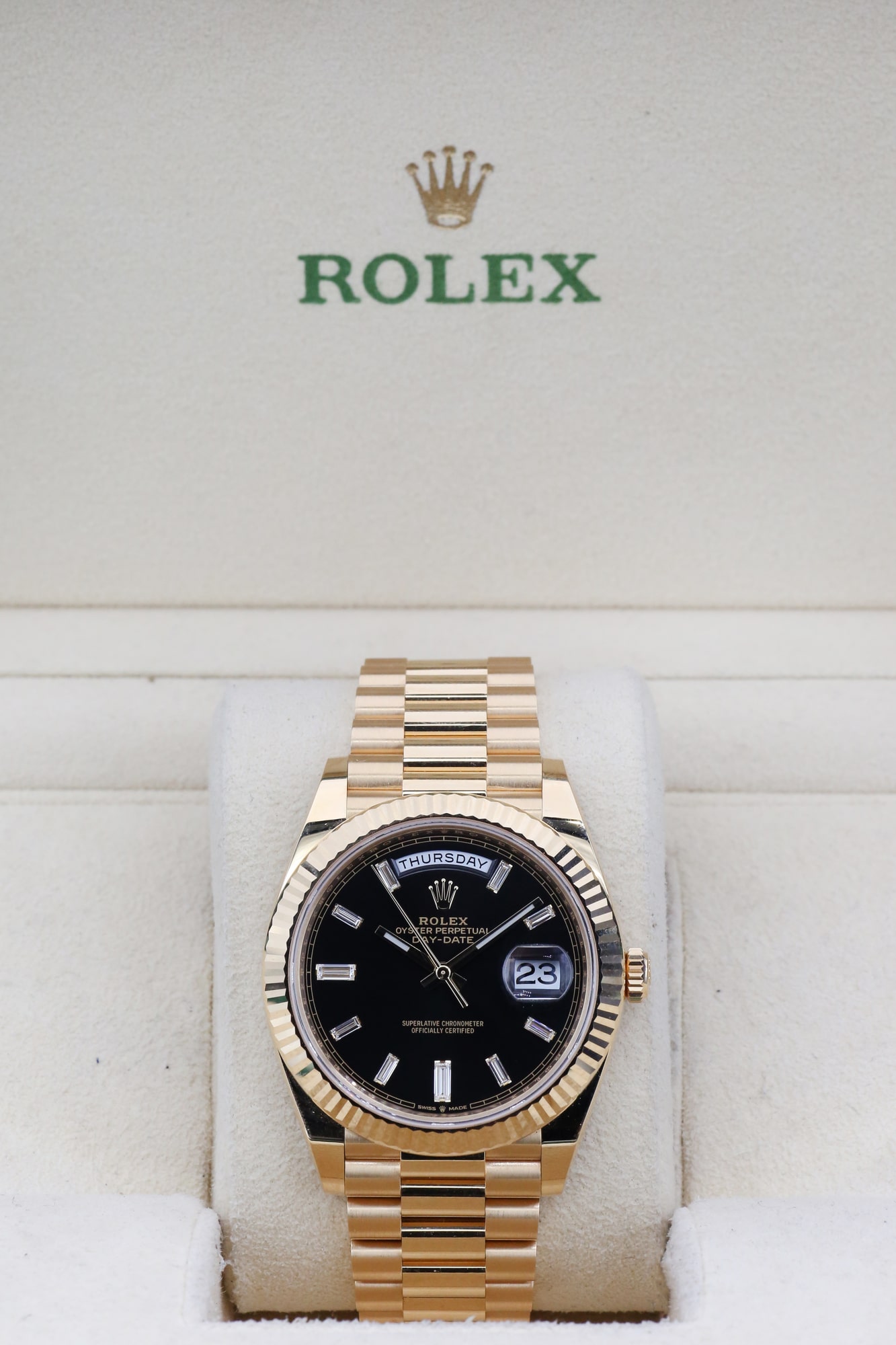 Brand: Rolex Model: Day Date Reference No: 228238 Case: Yellow Gold (YG) Bracelet: Presidential Size: 40 Dial: Black Baguette Bezel: Fluted Year: 2022 Condition: Preowned Box papers: Paperwork/Box Read More