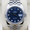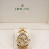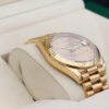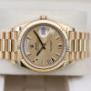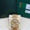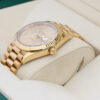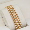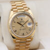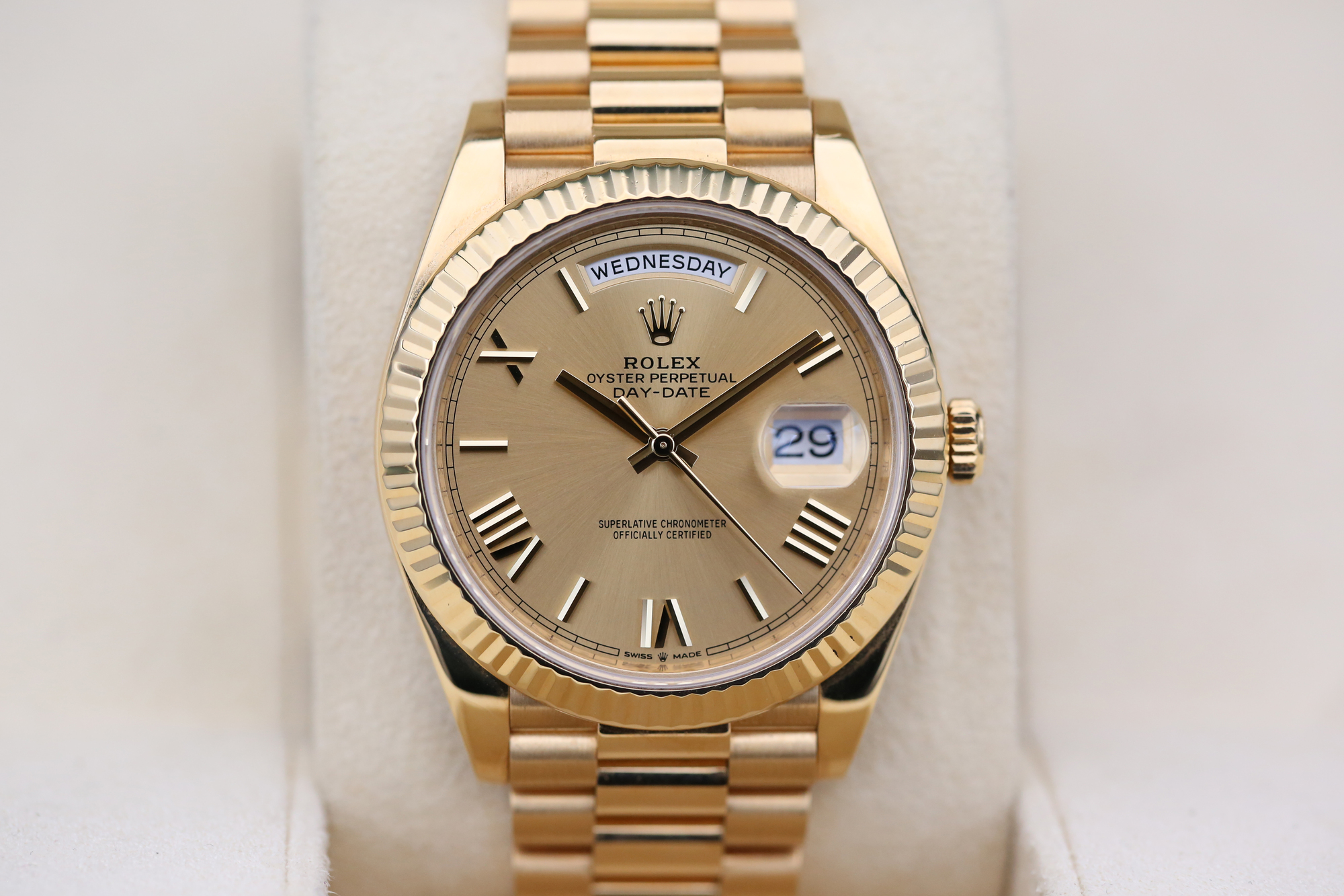 It has a stunning champagne dial, roman numeral hour markers, day window at 12 o’clock, date window at 3’oclock and has a fluted bezel.