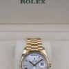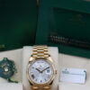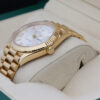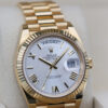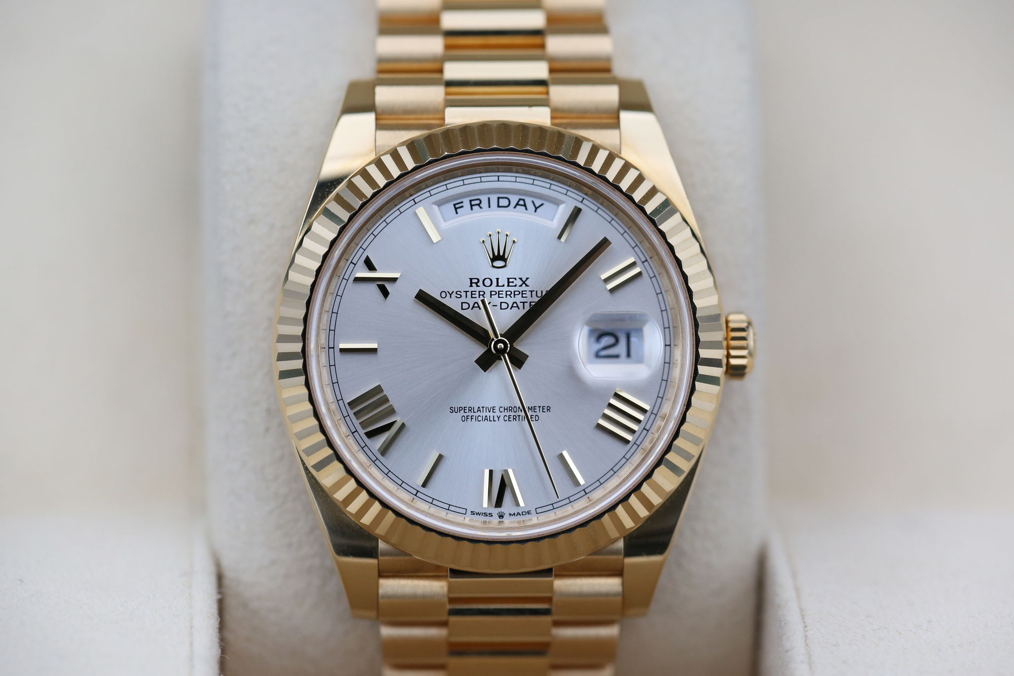 THE DAY-DATE BOASTS A STUNNING SILVER DIAL, ROMAN NUMERAL HOUR MARKERS, DAY WINDOW AT 12 0’CLOCK, DATE WINDOW AT 3 O’CLOCK AND HAS A FLUTED BEZEL.