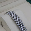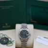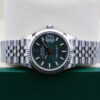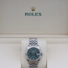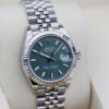 The watch is a beautiful combination of white gold and oystersteel that features a stunning mint green dial, a date window at 3 o’clock and a white gold fluted bezel.