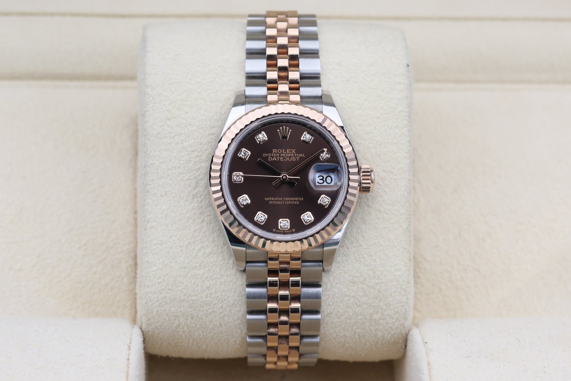 Brand: Rolex Model: Datejust Reference No: 279171 Case: Two Tone Rose Gold (TTRG) Bracelet: Jubilee Size: 28 Dial: Chocolate Diamond Bezel: Fluted Year: 09/2021 Condition: Preowned Box papers: Paperwork/Box Read More