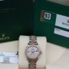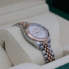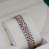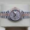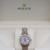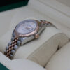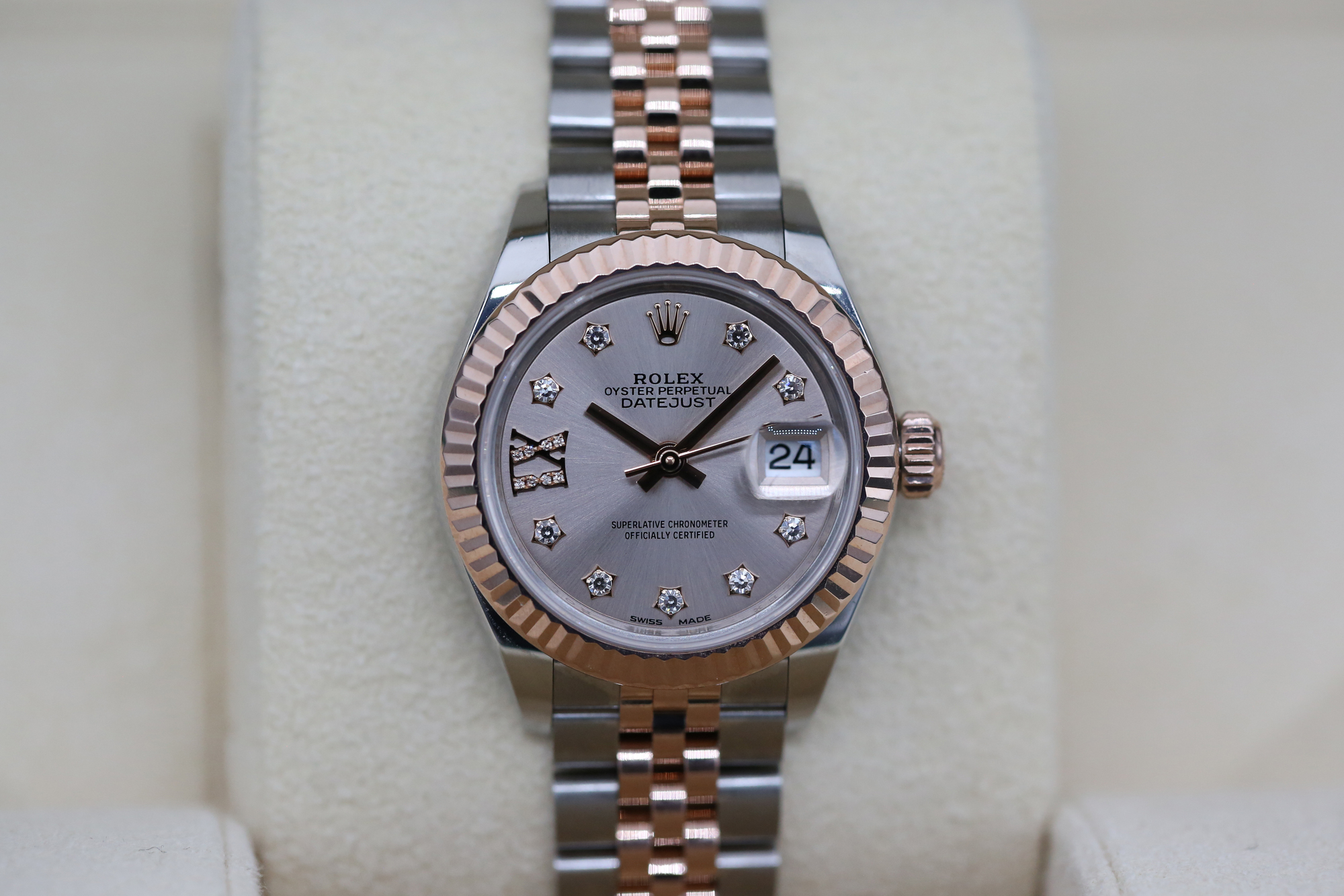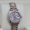This watch is a combination of 18ct rose gold and oystersteel that features a stunning rose dial with diamond hour markers, date window at 3 o’clock and a 18ct rose gold fluted bezel.